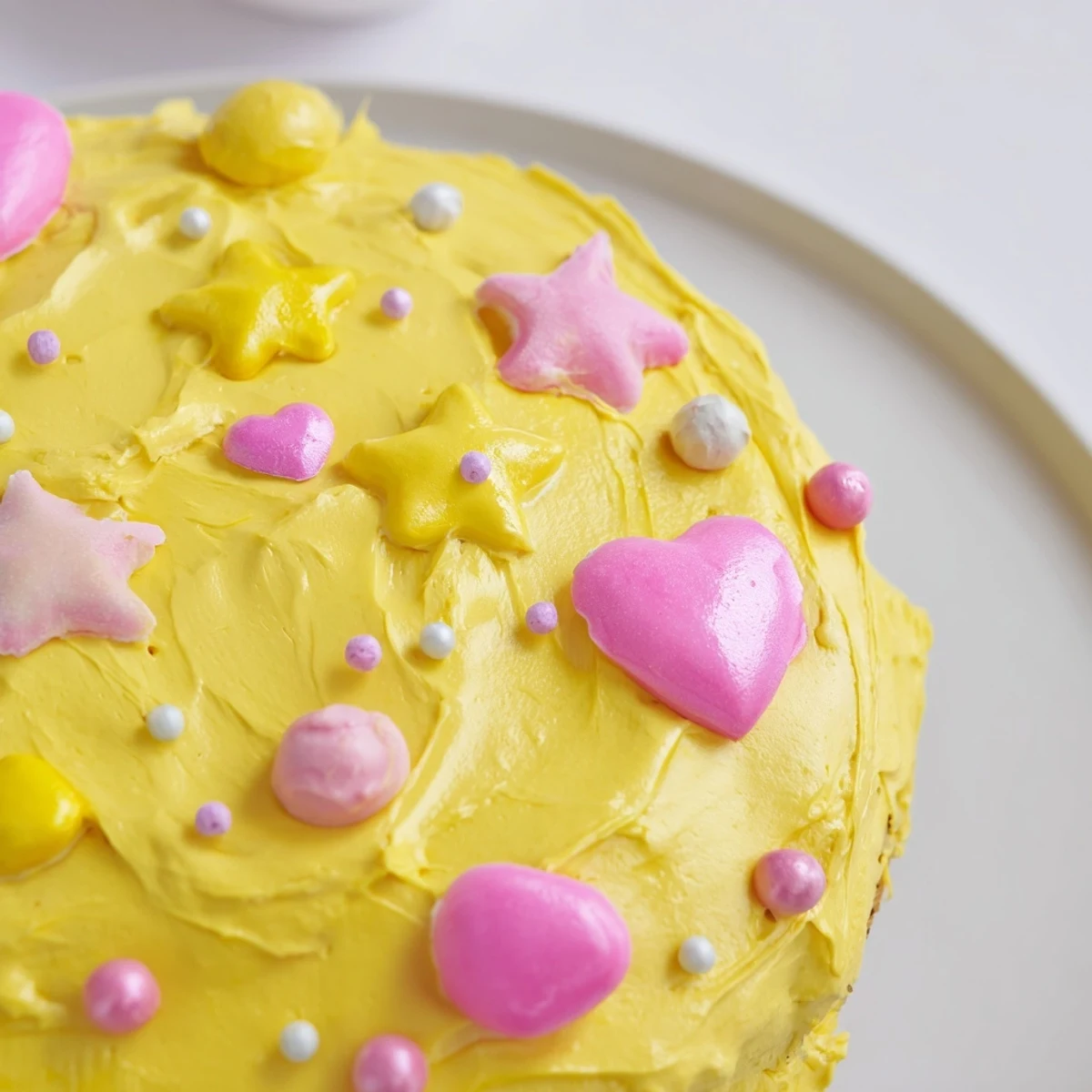 - Level cake layers if needed. Place one layer on a serving plate and spread with pink buttercream. Top with the second layer; frost the entire cake with yellow buttercream.