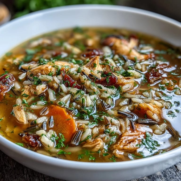 Save Wild rice has a wonderfully nutty, slightly chewy character that sets this soup apart from everyday chicken noodle. As it simmers in the herbed broth alongside sweet carrot slices and diced celery, it slowly absorbs all that savory goodness, swelling into tender, satisfying bites. The shredded chicken breast, added toward the end of cooking, stays juicy and moist, melding seamlessly with the vegetables and rice. A final scatter of fresh parsley brightens every bowl with a pop of color and a whisper of freshness. Simple, classic, and absolutely craveable.