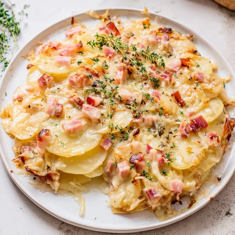 - Layer half of the sliced potatoes in the dish. Top with half the onions, garlic, ham, and Gruyère. Season with salt, pepper, thyme, and a pinch of nutmeg.