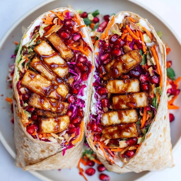 Save A vibrant, crispy wrap featuring sweet chili-glazed tofu, crunchy vegetables, and a festive slaw—perfect for a plant-based holiday meal or a flavorful weeknight dinner.