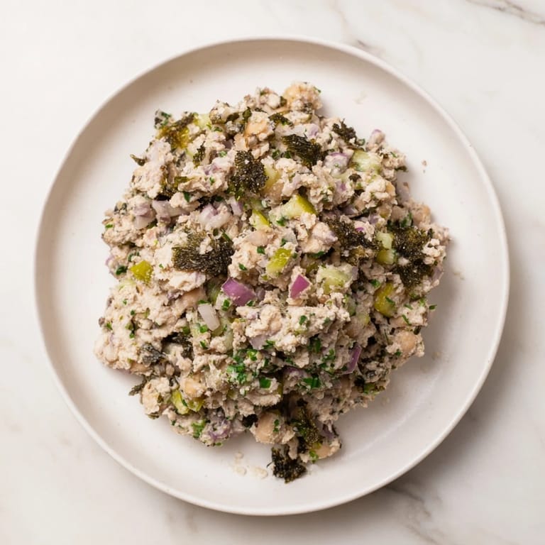 A vibrant, plant-based twist on classic tuna salad featuring mashed chickpeas and a touch of seaweed for an authentic ocean flavor. Perfect for sandwiches, wraps, or salads.