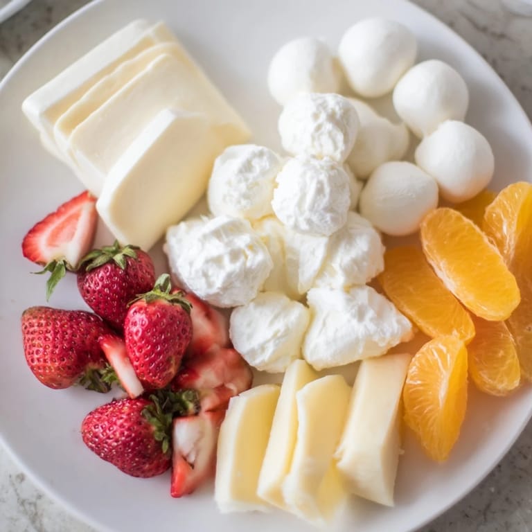 This vibrant grazing board features clusters of creamy cheeses shaped like clouds paired with a rainbow of fresh fruits arranged in colorful rows. Accompanied by crunchy crackers, bread, and whimsical sweet treats, it offers a visually stunning centerpiece for parties or celebrations. Fresh herbs and edible flowers add a final fresh touch. Preparation is quick, requiring no cooking, making it an easy yet impressive option for entertaining.