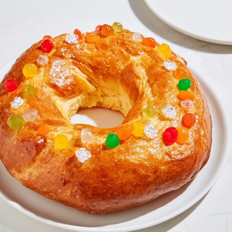 Save A festive and dazzling sweet bread shaped like a crown, adorned with colorful candied fruits and sugar pearls—a showstopping centerpiece perfect for celebrations.
