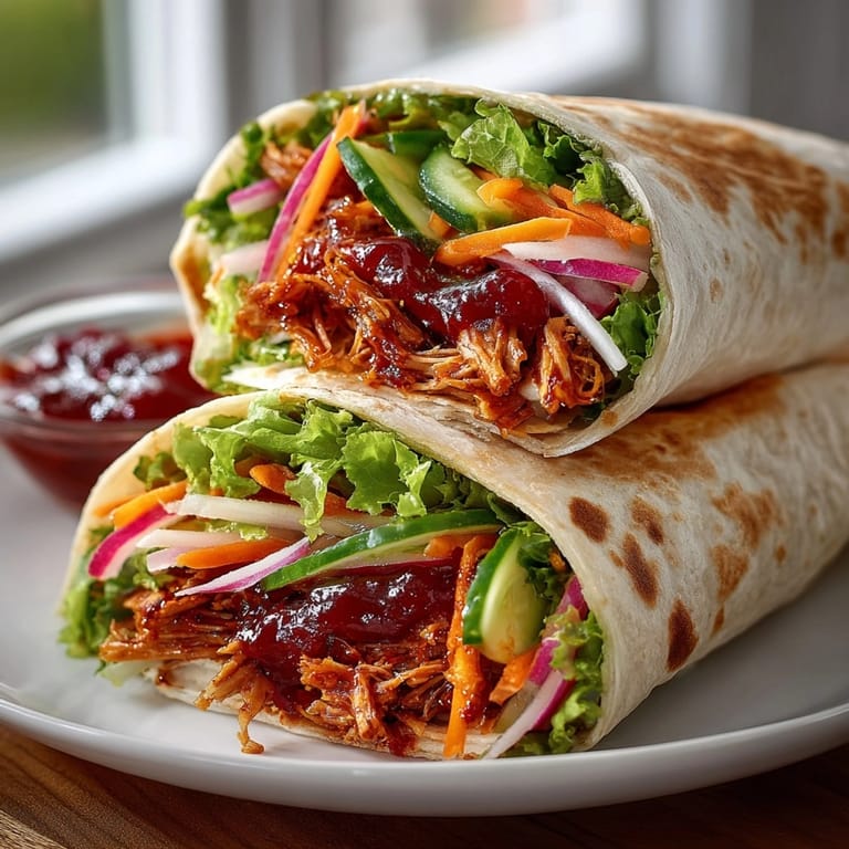 Enjoy tender pulled chicken tossed in a sweet-tart cranberry BBQ sauce, all wrapped up in a soft flour tortilla with crisp vegetables for texture and freshness. This dish balances smoky, tangy flavors with a satisfying crunch, making it perfect for either lunch or dinner. Quick to prepare and easy to assemble, these wraps offer a delicious combination of juicy chicken, vibrant sauce, and fresh greens, suitable for those seeking both comfort and convenience in a meal.