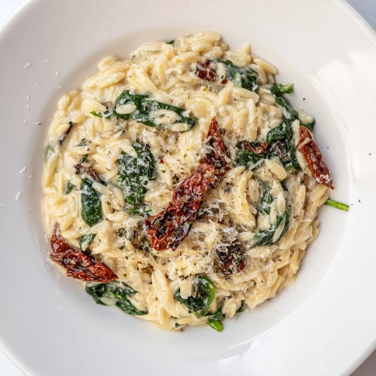 This comforting bowl features tender orzo pasta cooked in a creamy garlic and Parmesan sauce infused with Italian herbs. Sun-dried tomatoes and fresh baby spinach add bursts of flavor and color. The dish comes together quickly, making it perfect for a satisfying vegetarian meal. Garnish with extra Parmesan or olive oil for added richness.