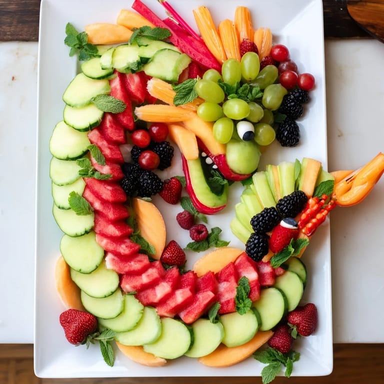 Save A whimsical and vibrant fruit tray arranged in the shape of a dragon, perfect for parties and celebrations. This show-stopping centerpiece combines a medley of fresh, colorful fruits for a healthy and impressive display.