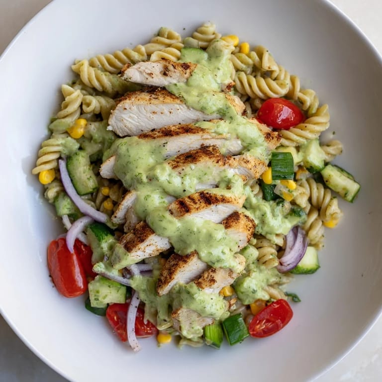 Save A vibrant, creamy pasta salad inspired by Peruvian flavors, featuring juicy chicken, fresh vegetables, and a spicy, herby ají verde sauce.