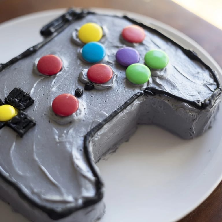 Shape the Cake: Once completely cooled, carve the cake into the shape of a classic video game controller using a sharp knife.