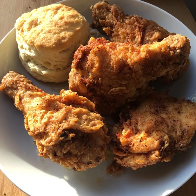 Save Crispy, juicy fried chicken paired with fluffy, buttery buttermilk biscuits—a classic Southern comfort meal perfect for gatherings and family dinners.