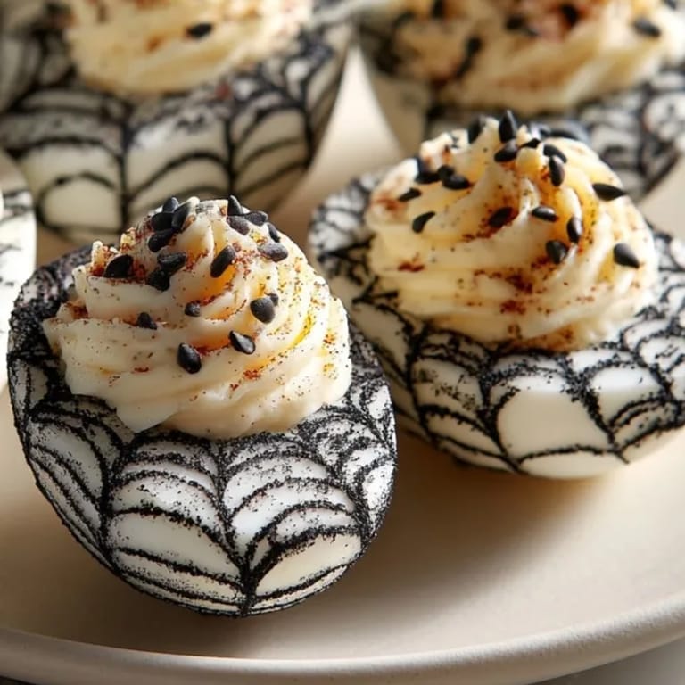 Prepare festive spiderweb eggs featuring a dramatic marbled shell and a creamy black sesame filling. Crack cooked eggshells lightly, soak in tea and black coloring for a web-like effect, then peel and halve the eggs. Blend yolks with mayonnaise, mustard, vinegar, and ground sesame seeds until smooth and savory. Spoon or pipe this mixture into egg whites and sprinkle with whole black sesame seeds for added texture. These visually striking eggs are perfect for Halloween parties or fun gatherings, offering a unique combination of flavor and presentation.