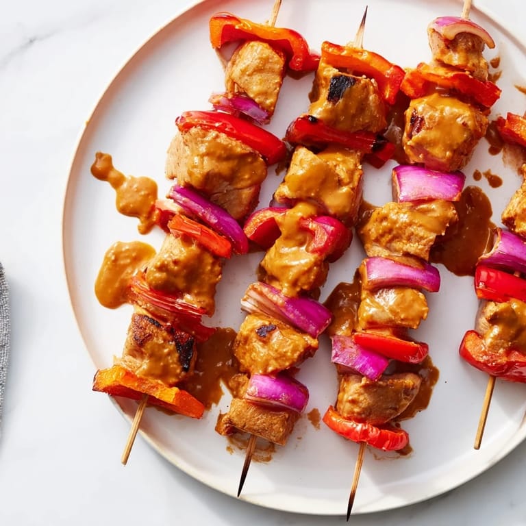 Save Juicy chicken skewers brushed with sweet-spicy peanut sauce, perfect for quick meals or appetizers.