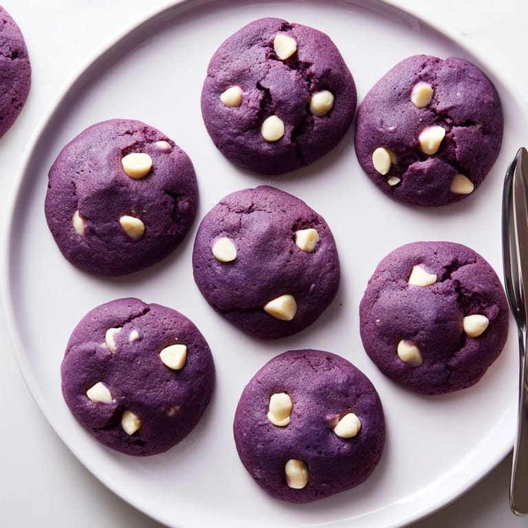 Save A festive dessert assortment featuring vibrant, chewy ube cookies with white chocolate chips, perfect for sharing at Thanksgiving gatherings.